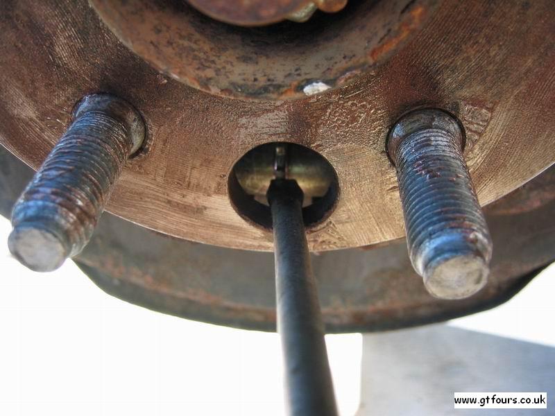 NB - make sure that the handbrake adjustment hole on the disk lines up with the handbrake adjustment hole on the hub as indicated