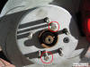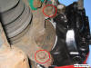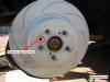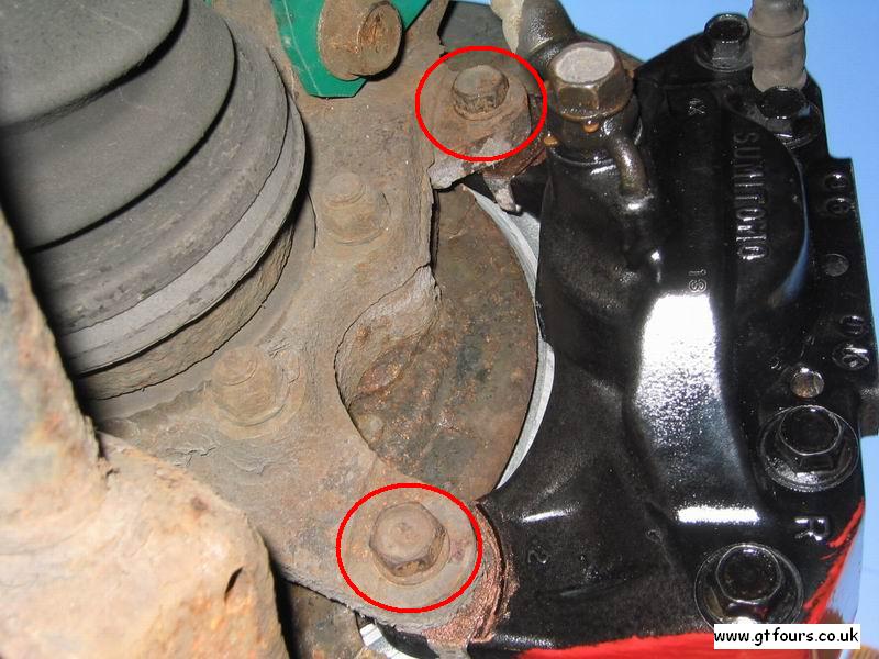 To do this, undo the two bolts holding the calliper onto the rear of the hub (as shown) and slide the calliper off the brake disk. Move it to rear of hub where it can be left to dangle whilst you remove the brake disk. Note - you may have to push the pads back in order to allow enough room to slide the calliper over the worn disk