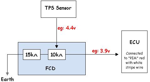 The theory is simple. All FCDs alter or bodge the voltage signal from the TPS. The resistor method drains a portion of the signal away down to earth. i.e. part of the signal produced by the TPS will be taken away. This is done through a potential divider network. The single fixed resistor is in place to ensure there is always part of the signal to be drained down to earth and so that you cannot short out the signal being sent from the TPS and potentially damage the TPS or ECU. The variable resistor is used to set an alterable point at which you want fuel cut to happen.