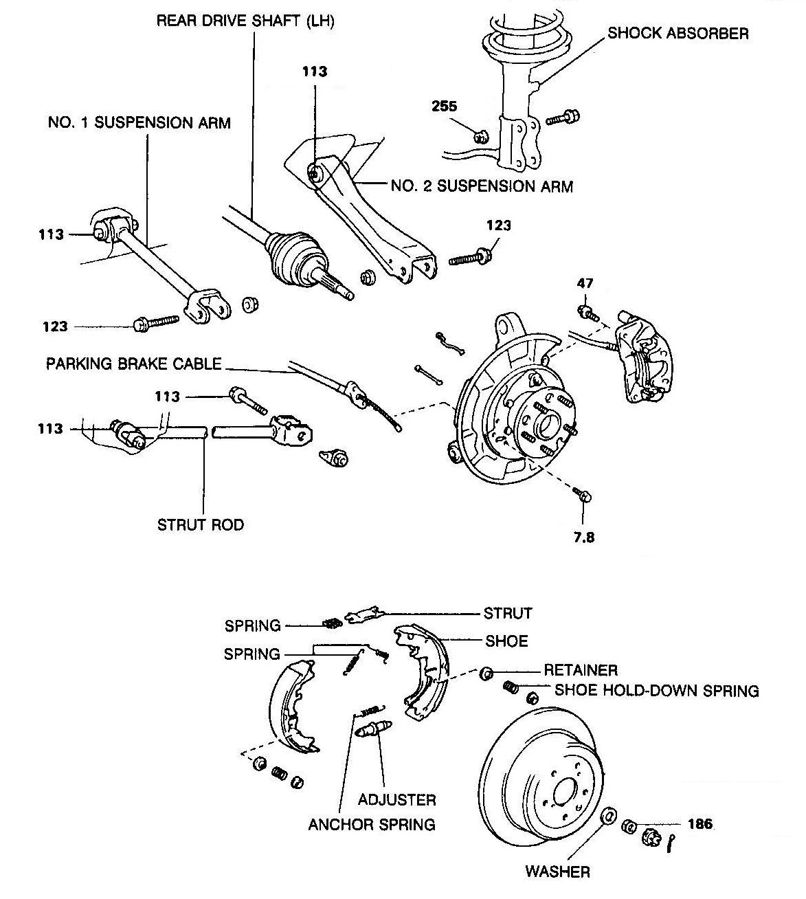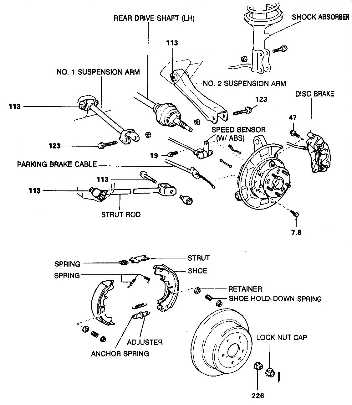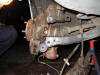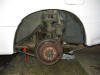 | Undo the trailing arm (strut rod) - secured between hub and in front of wheel arch Undo the front radius arm (No 1 suspension arm) - note this sets the toe in and out for the rear wheel. I didn't bother marking this up, seeing as though bushes etc will be replaced and will end up misaligned anyhow. This is awkward to remove and later replace. Some persuasion with screwdrivers / wrecking bars used as levers will help as this is recessed into the rear sub frame. Note that the fixing to the sub frame can only be undone BOLT end Undo rear radius arm (No 2 suspension arm) - straightforward It is preferable to remove the arms at the hub but in practice I found this difficult and undid the most accessible nut/bolt * Note that the nuts securing the arms have a metal "wing" so that you can "simply" undo them from the bolt side. In practice these were ball bouncingly difficult to remove, a breaker bar and a length of scaffolding pole will be required to shift them. Note the metal "wing" simply bent under the pressure Remove the brake calliper - undo 2 bolts at rear of disk and tuck the calliper out of the way |