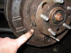 | To remove the rear disk, remove the rubber grommet from the disk in order to access the handbrake adjuster. Align the hole with the adjuster, (need a torch), and turn the adjuster to withdraw the shoes from the disk. The disk can then easily be pulled free. Note the hub nut, nut retainer and split pin should already have been removed by this stage (photo taken during a later brake adjustment) | |