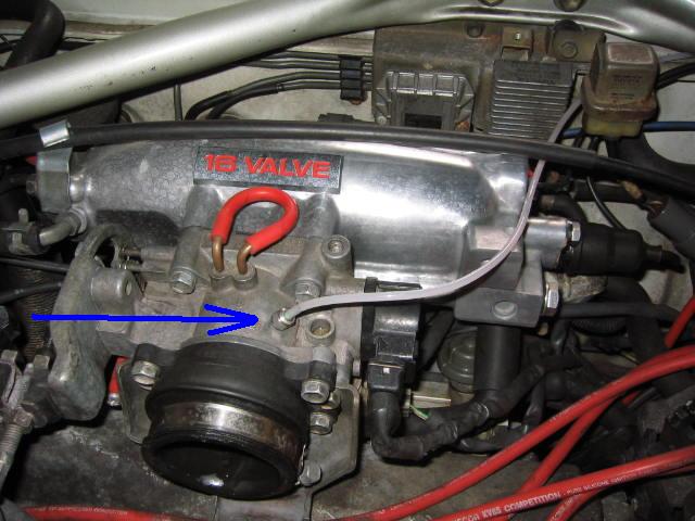 | Next was the nozzle. Carefully drill and tap a hole into the throttle body. Before drilling remove the IC and check that the nozzle will clear the butterfly valve throughout it's maximum extent of travel. Screw in the nozzle - mine was 0.5mm but I have recently bought a 0.4mm as I developed a bit of a misfire under boost with the WI activated | |