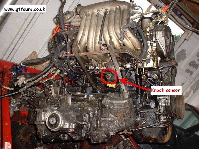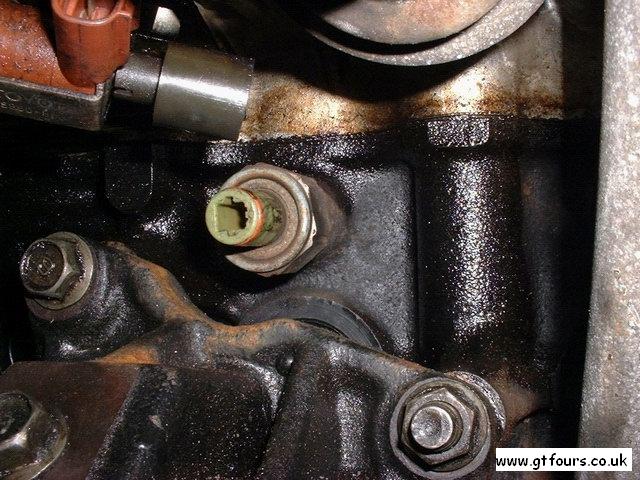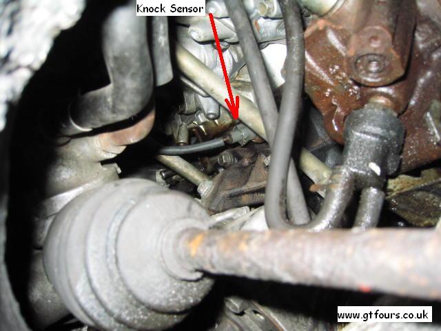 | Knock sensor location, remove with a deep reach 27mm socket | The sensor can be accessed by taking off the drivers wheel and peering in through the arch | Close up of knock sensor, torque to: 165/185 - 44Nm |